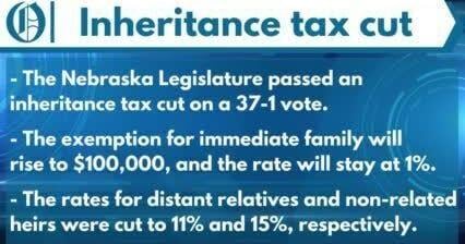 Until this TABLE 1. 11 to a bill that would cut Nebraskas inheritance tax rates while increasing the amount of property value that is exempt from the tax. Nebraska currently has the nations top inheritance tax rate 18 on remote relatives and non-related heirs.